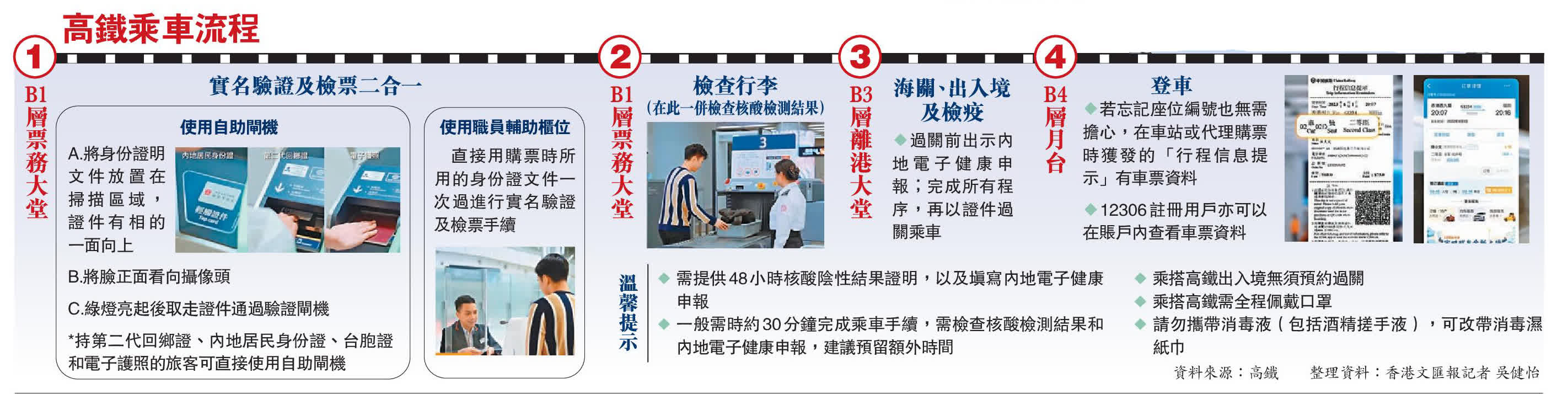 港鐵署理營運主管(高速鐵路)許振聲指出,市民購票必須實名,僅憑證件便可入閘上車。註冊12306賬戶時,必須提供一個可以接收驗證號碼短信的手機號,否則不能成功註冊。港鐵總經理(市務及客戶體驗)梁靜雯提醒市民搭乘高鐵時全程佩戴口罩,並切勿攜帶含有酒精的洗手液,因不能通過安檢。