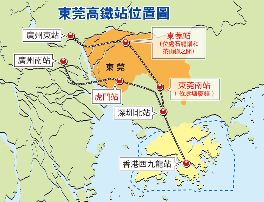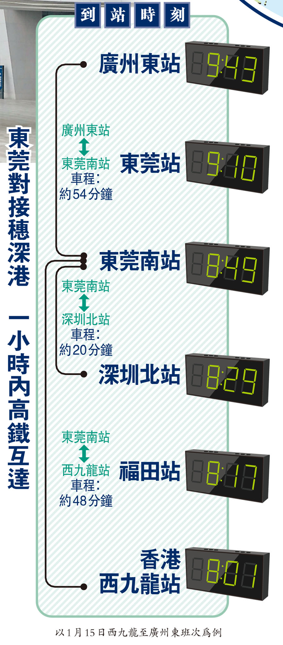 (香港文匯報記者 敖敏輝、李昌鴻 東莞、深圳連線報道)香港西九龍開通至廣州東站高鐵列車,途徑東莞、東莞南兩個站點,原西九龍至廣州南站線路則在虎門設有站點,兩線並進,使東莞成為擁有3個連接兩地站點的城市,距離香港、廣州、深圳均在高鐵一小時車程內。關注高鐵最新消息的港商向香港文匯報記者表示,東莞兩條高鐵線、3個高鐵站,除了旅客在穗莞深港出行便利之外, 還將帶動東莞與大灣區乃至更大範圍經貿往來更加順暢,利好高鐵沿線產業「引進來」、「走出去」。同時,創新資源亦將加速流通,特別是內地這些年湧現的科技創新研究和成果轉化產品,將更快對接香港,加速廣深港澳創新科技走廊建設。