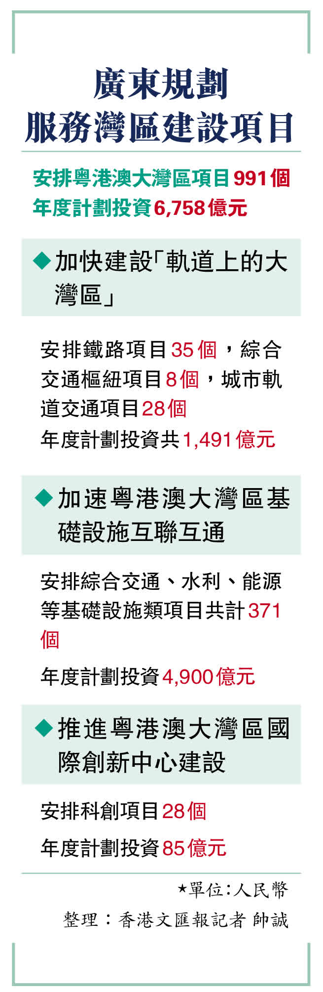 報告在2023年工作安排中,將縱深推進粵港澳大灣區、深圳先行示範區建設,高水平建設橫琴、前海、南沙三大平台放在首位,並強調了對接香港「北部都會區」發展策略,深入實施「灣區通」工程,實施好「澳車北上」,加快推動「港車北上」。高質量建設港澳青年創新創業基地,為港澳居民在粵發展提供更加便利條件。此外,廣東還將加快建設河套深港科技創新合作區等重大創新平台。推進深港口岸經濟帶建設,打造深港合作新引擎。