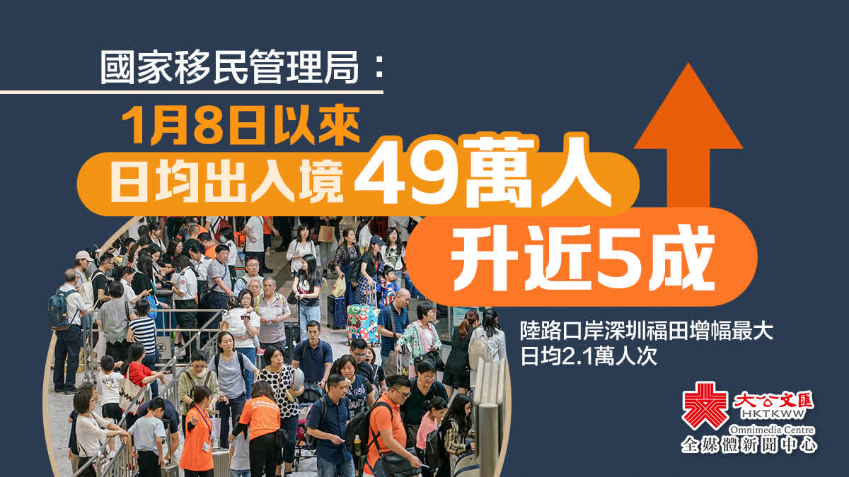 (大公文匯網記者 劉凝哲)國家移民管理局邊防檢查管理司司長劉海濤今日表示,自今年1月8日新冠感染「乙類乙管」正式實施後,出入境人員數量呈現穩步增長、有序恢復的態勢。截至目前,海港、陸路、空港口岸日均出入境人員分別為2.1萬、42.4萬、4.5萬,較實施前各上升了13%、53.3%、33.2%,為2019年同期的36.4%、30.1%、11%。其中,空港口岸,上海浦東國際機場客流最多,日均1.1萬人次,陸路口岸深圳福田口岸增幅最大,日均2.1萬人次。