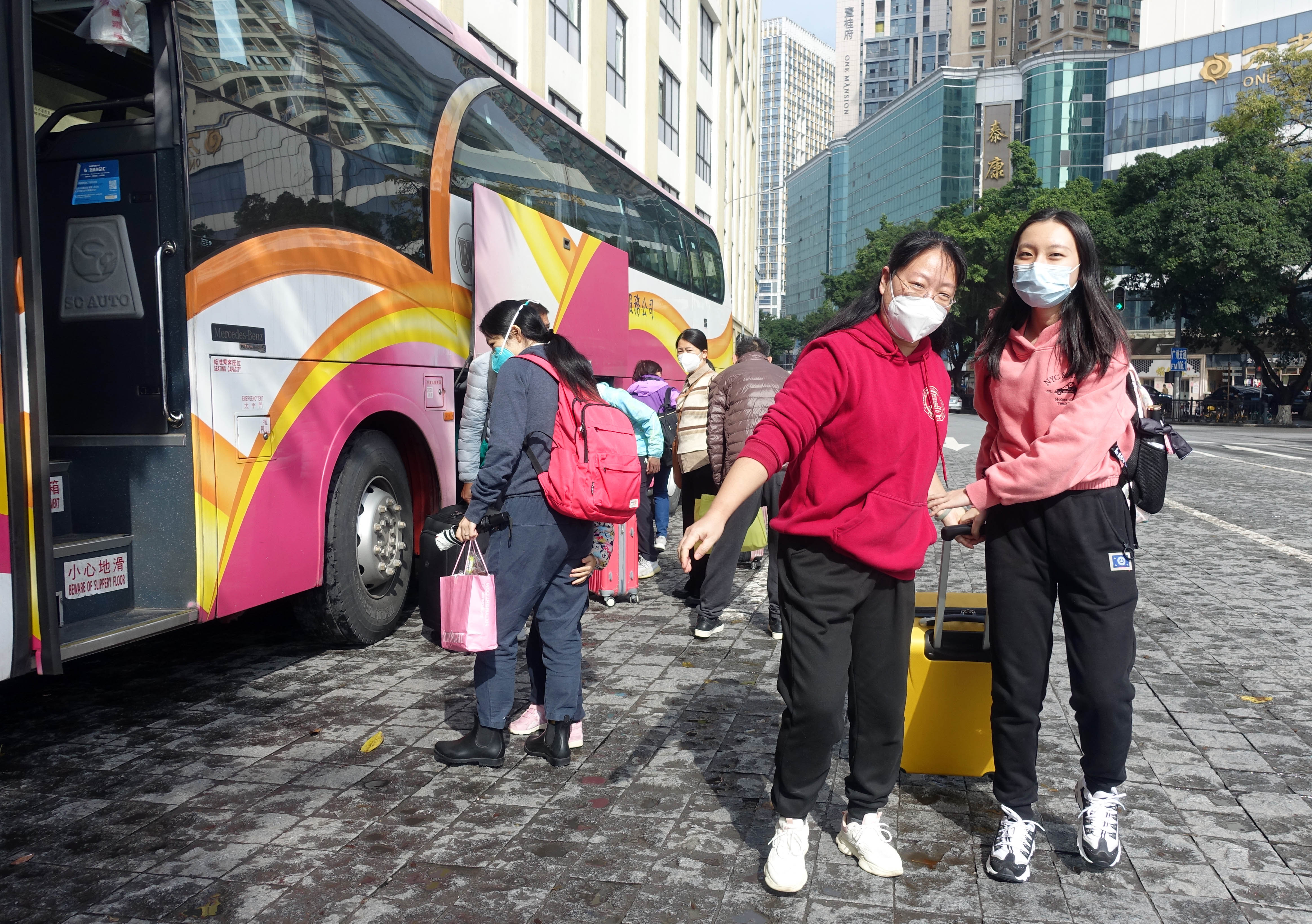 首班從香港到廣州的14名乘客徐徐下車,部分親友已經在廣州賓館下車點等候。一個女生下車後,立刻飛奔到她媽媽面前,給了對方一個大大的擁抱。「早上9:45從中港城站點上車,3個小時就到這裏了,路上都很順暢,能夠和家人團聚很開心。」這是在香港讀研究生的林同學,她去年8月暑期去到香港上學,原以為寒假也將留港度過,很幸運半年不到就遇到香港恢復通關,原本計劃是不回來過春節的,現在很容易就在微信小程序上買到票。身邊也有同學兩年沒有回內地與家人團聚,這次恢復通關後也買到車票回來。