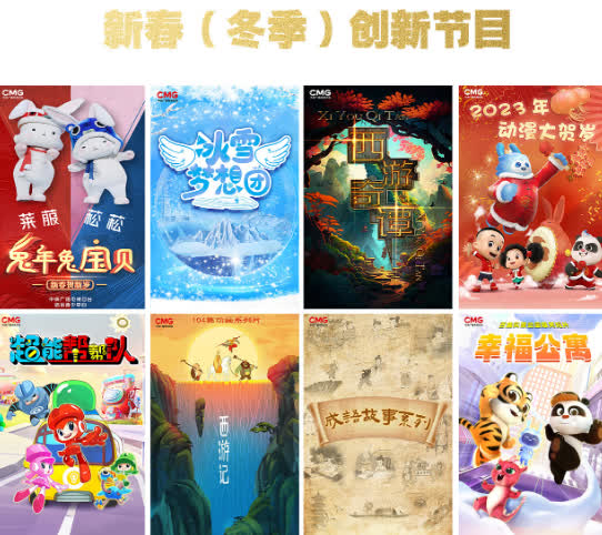 新春(冬季)創新節目板塊,推出季播節目《兔年兔寶貝》《冰雪夢想團》《西遊奇譚》,動畫片《2023年動漫大賀歲》《超能幫幫隊》《西遊記》《成語故事系列》《幸福公寓》8個創新節目。其中,親子互動融媒體文化綜藝節目《兔年兔寶貝》和總台賀歲新片《2023年動漫大賀歲》,圍繞歡度兔年春節主題,讓觀眾看有所得、玩有所學,歡樂過大年。