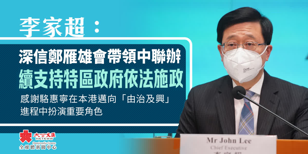 李家超深信鄭雁雄會帶領中聯辦繼續支持特區政府依法施政,共同全面準確貫徹落實「一國兩制」、「港人治港」、高度自治方針,維護憲法和基本法確定的特區憲制秩序,落實「愛國者治港」原則,並在香港開創新局面、實現新飛躍的關鍵期,與特區政府攜手合作,協助推動香港融入國家發展大局,為實現中華民族偉大復興作出更大貢獻。