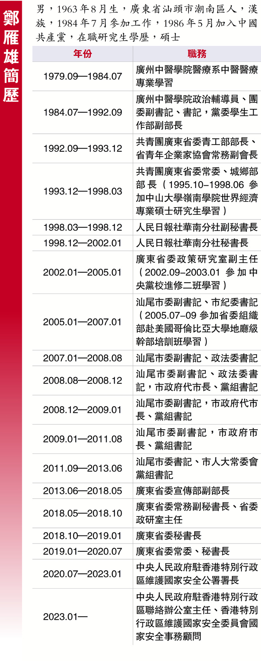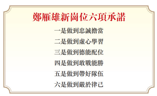 鄭雁雄表示,堅決擁護、堅決服從中央的決定,衷心感謝習近平總書記和黨中央的信任。在習近平新時代中國特色社會主義思想的指引下,在黨中央堅強領導下,駱惠寧同志帶領中聯辦同事極盡艱辛,努力推動香港由亂到治、由治及興,取得一系列突破性進展、標誌性成果,為我們打下很好的工作基礎。駱惠寧同志親清的人格魅力、高超的領導藝術、無私的擔當精神、扎實的工作作風,為大家樹立了榜樣、作出了表率。香港工作是「國之大者」,是中華民族偉大復興的重要一環,目前正處在從由亂到治走向由治及興新階段的關鍵時刻,自己一定在新的崗位上忠誠履職、擔當作為,不負重託、不辱使命。一是做到忠誠擔當,更加深刻認識「兩個確立」是大局所需、歷史所昭、民心所向,更加自覺做到「兩個維護」,在任何時候、任何情況下都擔當起中央賦予的職責使命。二是做到虛心學習,向黨的創新理論學、向實踐學、向歷史和書本學、向同志們學,不斷提升履行崗位職責所需的理論素養和專業能力。三是做到德能配位,堅持從政治上把握和處理問題,把香港工作置於黨和國家事業的全局來謀劃,不斷提升政治判斷力、政治領悟力、政治執行力,努力在辨別政治是非、保持政治定力、駕馭政治局面、防範政治風險上作表率。四是做到敢戰能勝,面對香港由治及興的新機遇新挑戰,按照習近平總書記去年7月1日在港重要講話精神和黨的二十大對港戰略部署,全面準確、堅定不移貫徹「一國兩制」方針,堅持乘勢而上、穩中求進,發揚鬥爭精神,警惕風險隱患,支持香港在中華民族偉大復興的歷史進程中作出新的更大貢獻。五是做到帶好隊伍,帶頭嚴格執行民主集中制,與班子成員一道互相學習、互相融合、互相提醒、互相幫助、互相補台,共同做好工作。六是做到嚴於律己,始終保持頭腦清醒、高度警戒,帶頭築牢落實中央八項規定精神堤壩,帶頭廉潔自律,從嚴要求自己,用實際行動詮釋忠誠乾淨擔當。
