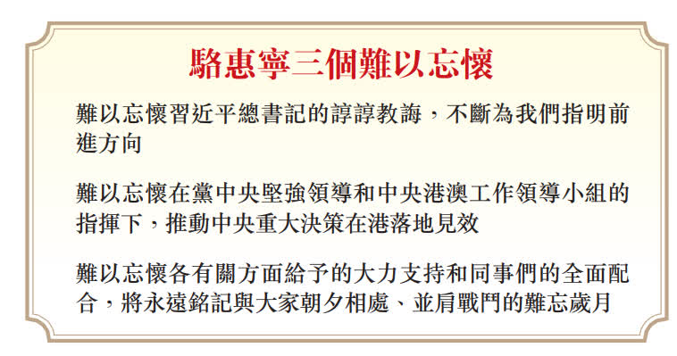 駱惠寧表示,這次中央對中聯辦主要負責人的調整,充分體現了以習近平同志為核心的黨中央對香港工作的重視與肯定,完全擁護中央決定。駱惠寧談到,修例風波爆發以來,面對香港局勢動盪變化,黨中央堅持依法治港,引領香港局勢實現由亂到治的重大轉折,開啟了香港從由亂到治走向由治及興的新階段。這一切根本在於習近平總書記掌舵領航,在於習近平新時代中國特色社會主義思想科學指引。回望過去三年,由衷感恩習近平總書記和黨中央的信任和關懷,參與了跑好這段實現重大轉折的「一國兩制」實踐接力賽。難以忘懷習近平總書記的諄諄教誨,不斷為我們指明前進方向;難以忘懷在黨中央堅強領導和中央港澳工作領導小組的指揮下,推動中央重大決策在港落地見效;難以忘懷各有關方面給予的大力支持和同事們的全面配合,將永遠銘記與大家朝夕相處、並肩戰鬥的難忘歲月。駱惠寧表示,鄭雁雄同志政治立場堅定,大局意識強,領導經驗豐富,富有鬥爭精神,工作有魄力,自我要求嚴,在香港維護國家安全方面做了大量開創性的工作。相信在鄭雁雄同志帶領下,中聯辦一定能深刻領悟「兩個確立」的決定性意義,增強「四個意識」、堅定「四個自信」,全面貫徹黨的二十大對港澳工作的戰略部署,弘揚偉大建黨精神,牢記「三個務必」,戮力同心、接續奮鬥,以實際行動做到「兩個維護」,在新時代新征程上推動香港開創由治及興的新局面、為實現中華民族偉大復興更好發揮作用。