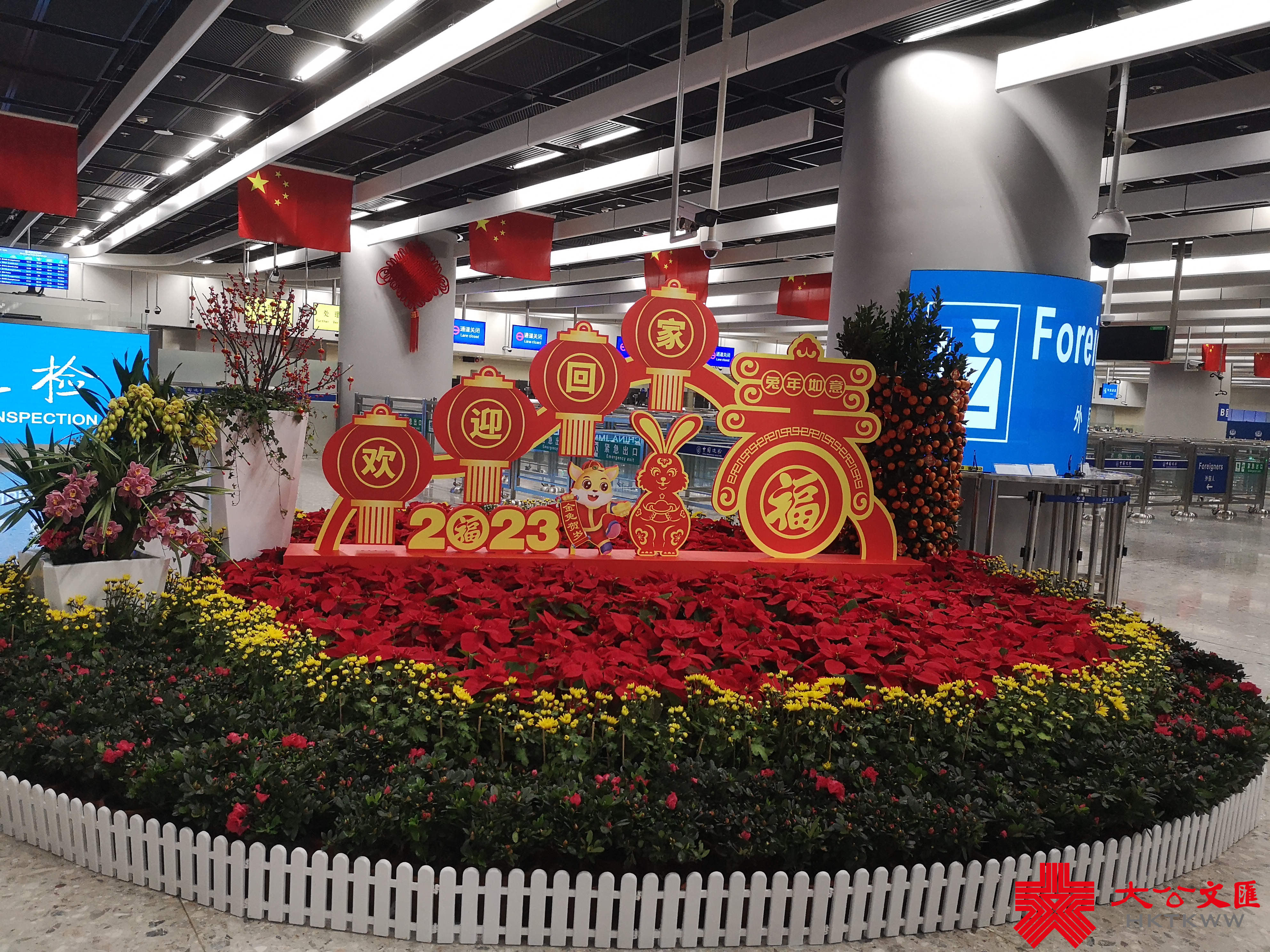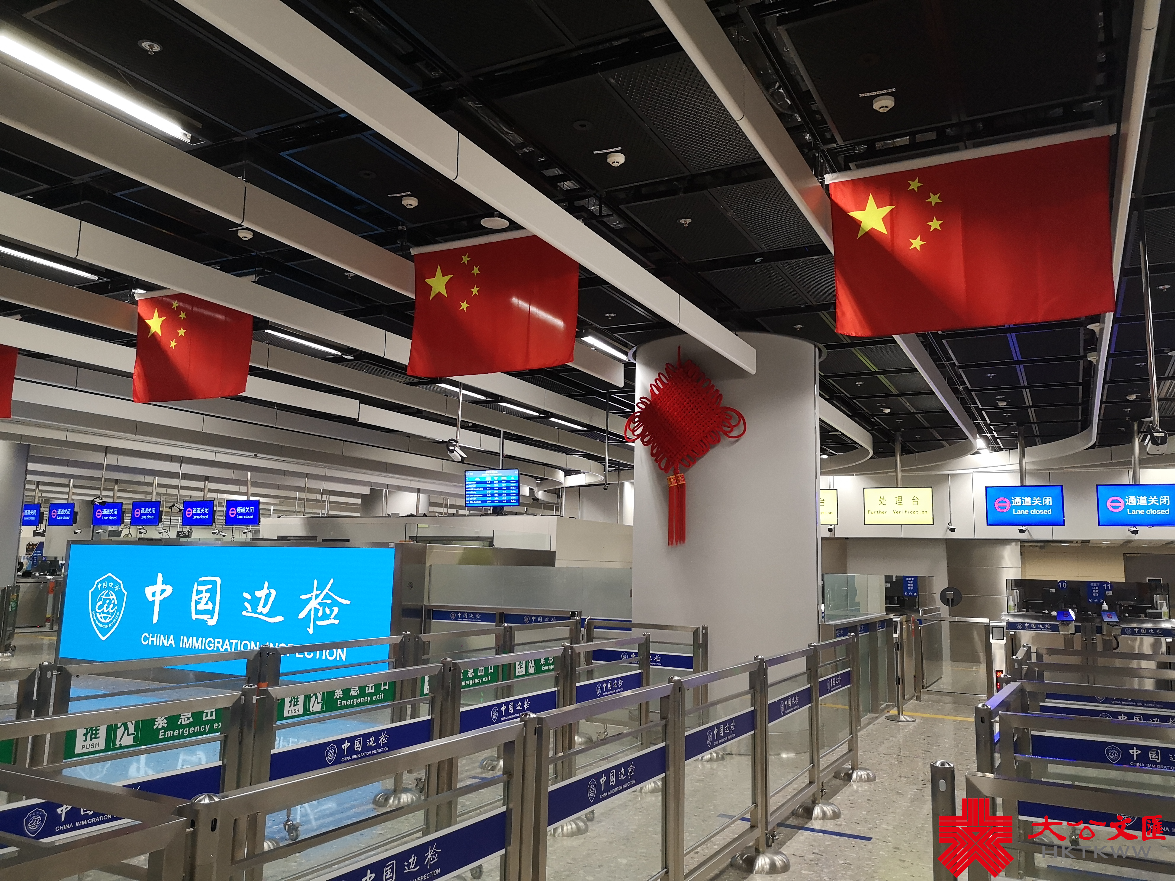 (大公文匯網 記者 石華)15日早上六點,記者在廣深港高鐵西九龍站口岸看到,口岸內布置有燈籠、中國結、國旗懸掛,節日氛圍花壇映入眼帘,「深港同心、口岸同行」背景板在B3入境大廳最中間位置格外醒目,6點半打開了深港分界線。