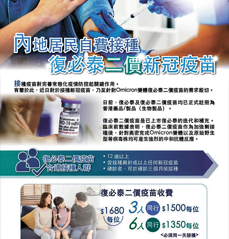 (香港文匯報 記者 吳健怡)隨着香港與內地開展首階段復常通關,不少內地居民擬來港旅遊兼接種新冠疫苗。香港私家醫院和私營醫療機構看準商機,推出有關服務套餐,內地社交平台更有相關「攻略」。香港文匯報記者「放蛇」發現,自費接種疫苗收費懸殊,每針介乎1,400港元至2,600港元。有醫療機構和內地中介對接種二價疫苗的要求說法不一,更有中介聲稱就算之前只打一針也能接種二價疫苗,與香港特區政府最少一針加一次確診的指引有明顯出入,且內地人臨時取消預約不獲退款,接種前又要簽免責條款,若事後出現疫苗副作用,醫療機構一律不負責。有藥劑業建議特區政府統一接種指引,又呼籲內地旅客了解清楚才接種。
