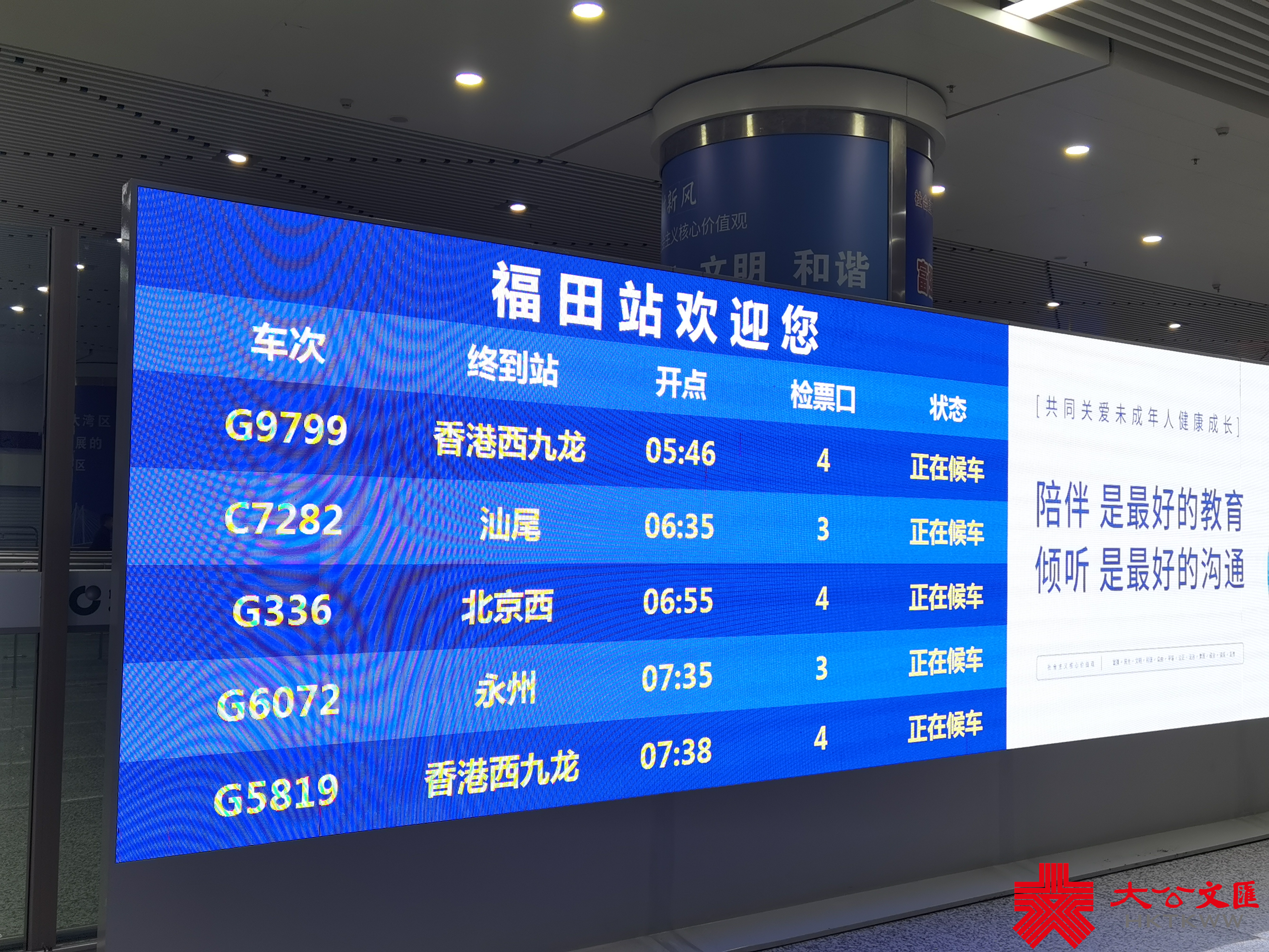 (大公文匯網 記者 郭若溪)廣深港高鐵香港段今日(15日)復運。記者早上5:30已抵達福田高鐵站,現場看到,站內各項準備工作已然就緒,候車大廳外的的士廣場上掛滿了燈籠,站內通火通明,車站大屏幕上正滾動播放着高鐵通關首日往返車輛的相關信息。據了解,深圳北站至香港西九龍站首趟開出列車G5607次於7:24始發,7:42抵達香港西九龍;福田站首趟開出列車G5819次將於7:38始發,7:52到香港西九龍。