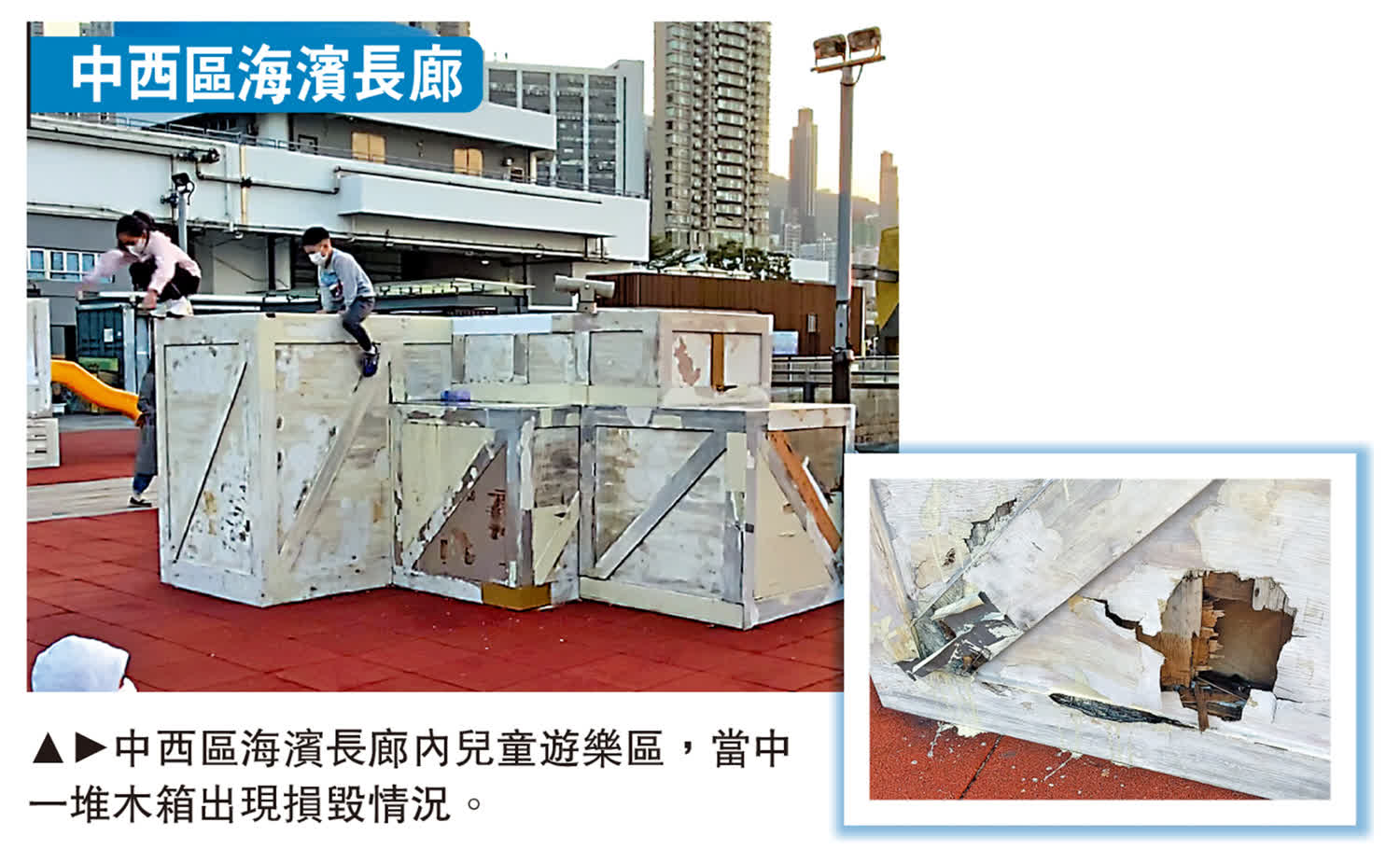屯門公園內設有嬉水區給兒童玩耍,但有市民發現沒有人玩時,水還是繼續流出,而且地面去水系統未能即時令水流走,令上址長期都有水氹,兒童跑過,分分鐘會被滑倒。此外,中西區海濱長廊內設有一個兒童遊樂區,當中一堆木箱十分受兒童歡迎,不斷有兒童跑上跑下,但木製的設施懷疑因近海邊引致木板損毀,損毀部分更遍布各處,包括兒童經常會觸及的部分。