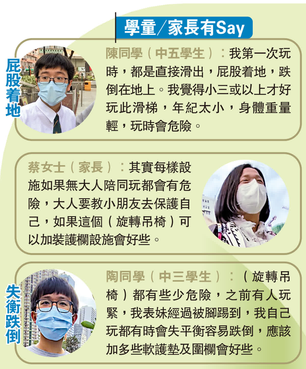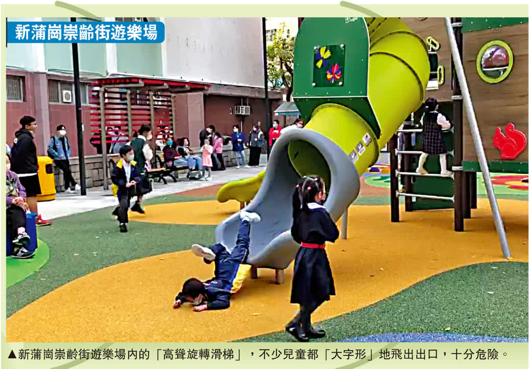 「衝啊!」下午時分的崇齡街遊樂場內好不熱鬧,數十名兒童及學生都在玩新建、近六米高的旋轉滑梯設施。記者實測該旋轉形的滑梯,發現非常順滑,因此到達出口時會因衝力太猛而直飛落地。當日記者目測,半分鐘內有近十名兒童由滑梯衝下,當中有三、四人「大字形」直摔到出口的軟墊上;不少兒童急不及待瀡下滑梯,多名兒童相距甚近,前一個剛到出口,後一個緊隨下,不是把前一個踢出滑梯,就是雙雙撞在一起。