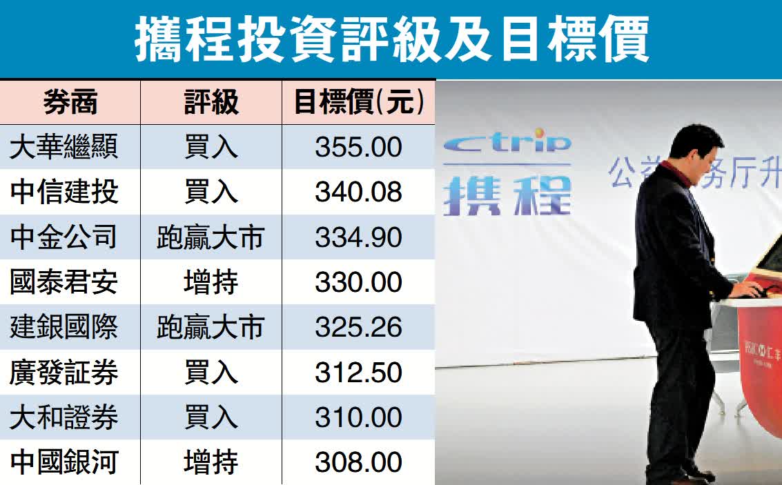 隨着正式通關,信誠證券聯席董事張智威表示,攜程股價很可能迎來較大升幅,目標價320元。該股上周五收報291.8元。