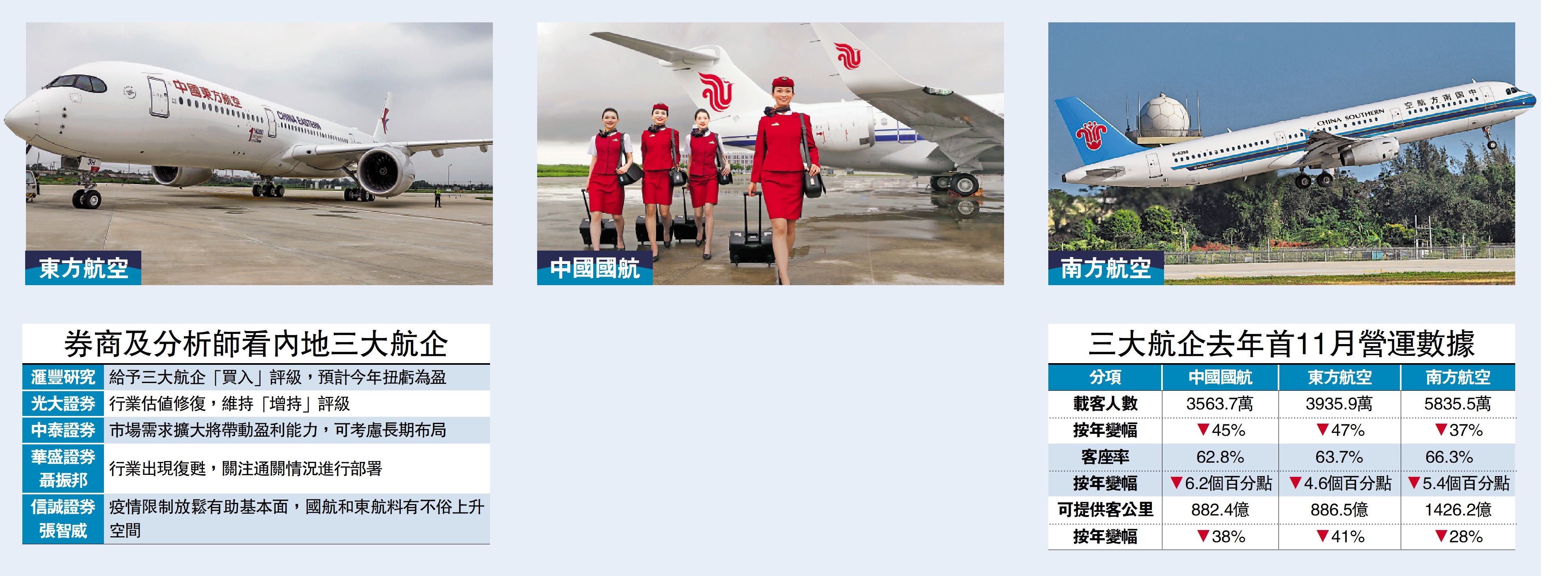 防疫措施全面放寬後,旅遊市場暢旺,出行人次猛增,市場看好航空業前景。滙豐研究發表報告指出,內地取消疫情相關入境限制,提振國際機票預訂量,令航空公司運力回升速度超出預期,將抵銷境內機票價格壓力,並提升乘客收益率,給予內地三大航空公司「買入」評級,預計今年扭虧為盈,並在明年之前錄得340億元人民幣的累計利潤。該行最看好國航,因具有國際業務。