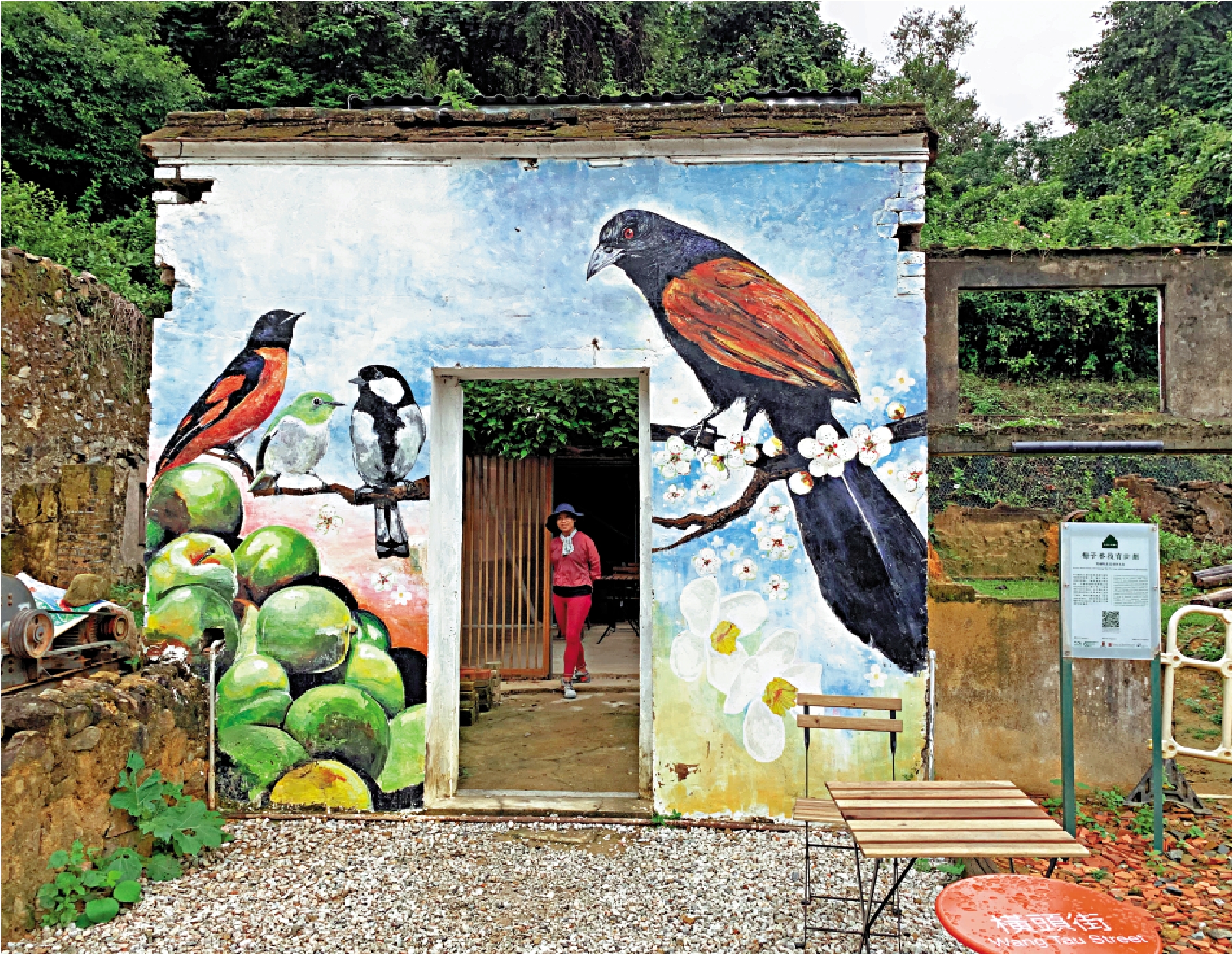 一大早,這裏成為遊客和村民休憩的場所。跟隨遊客的隊伍,穿過廟宇和鄉間小路,進入爬山路段。陰雨時節,前往梅子林的路上,空氣濕冷,夾雜着泥土、樹葉的香氣。行約20分鐘,來到了梅子林的村口。村口的大樹上掛着士多店的指路牌,樹下附近的幾片瓦片上寫着「梅子林」三個字。