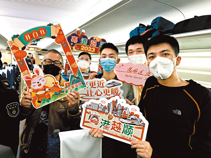 香港文匯報記者在廣州東站的站台上還看到,廣州東站發出的首班車和到達的首班車都在車窗貼上了兔年主題窗花。廣九客運段列車長劉靜透露,他們還特意為每位旅客準備了一套新春祝福的明信片,明信片上寫有「兔年大吉」「讓家更近,讓心更暖」等祝福語,希望能讓旅客感受到賓至如歸的溫暖。