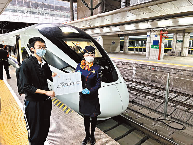 在廣州東站始發的首班車G6551上,有一位特別的乘客。今年在廣州讀高一的李同學是中國高鐵的「鐵桿粉絲」,談起各種高鐵車型的區別和特點如數家珍。得知15日廣深港高鐵香港段恢復通車後,李同學特意買到當天廣州東站始發的首班車前往深圳北,並花2小時自製了一幅高鐵圖畫送給列車長,畫中有一輛標有G6551車次的和諧號列車,並寫上了「廣州東—香港西九龍」字樣。「我本身很喜歡中國高鐵,這又是恢復正常通關後由廣州東始發香港的首趟高鐵,非常有紀念意義。」他坦言,上次去香港還是2015年,恢復正常通關後準備2月初去香港。