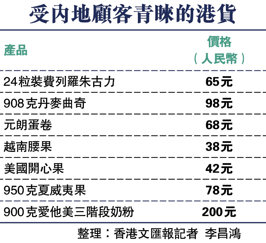 記者在商城大門入口一家商舖看到,許多顧客前來購買港版意大利產的費列羅(即港稱「金莎」)朱古力,24粒裝價格為65元,與香港市場價格相近。備受顧客青睞的小罐裝丹麥藍罐曲奇幾天前就已經斷貨,只有大罐裝900多克曲奇,售價98元。