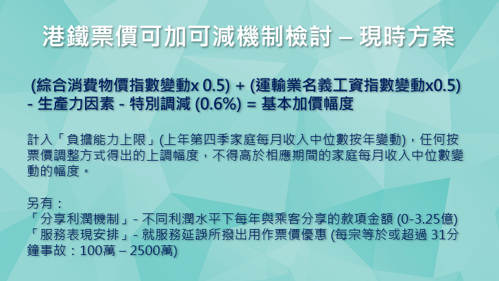 根據現行可加可減方程式,(0.5 x 綜合消費物價指數變動)+ (0.5 x 運輸業名義工資指數變動) — 生產力因素 — 特別調減(0.6%)= 基本加價幅度。而最終票價調整幅度,還需要考慮「負擔能力上限」,上調幅度不得高於前一年第四季「家庭住戶每月入息中位數」的按年變動率,若幅度介乎-1.5%至+1.5%之間,則該年票價不會做出調整並會轉撥至隨後一年計算。