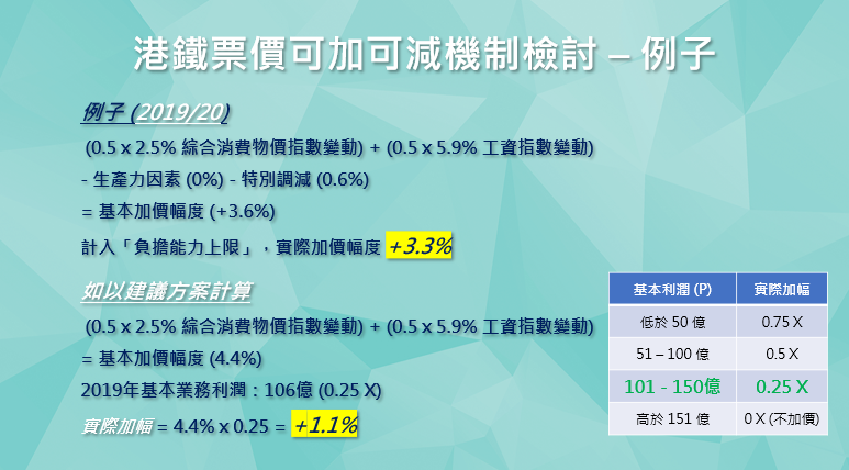 在維持基本計算方程式(0.5 x 綜合消費物價指數變動) + (0.5 x 運輸業名義工資指數變動)= 基本加價幅度(X)和負擔能力上限機制不變的情況下,引入利潤對沖機制,以利潤系數對沖加價幅度,在基本加價幅度(X)為正數時,乘於相關系數,對沖加價幅度,並取消延後增幅機制。