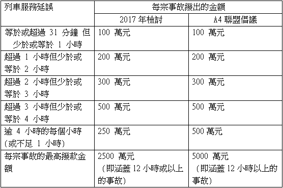 除了量化服務表現安排外,也需要增加每宗事故罰款上限。A4聯盟建議,延誤逾4小時的每個小時(或不足1小時)罰款增至500萬元,每宗事務最高撥款金額上限從目前的2500萬,增至5000萬,若在1個月內再出現類似事故,影響一定乘客或車站數目超過某個數值,則再需加重一倍罰款。