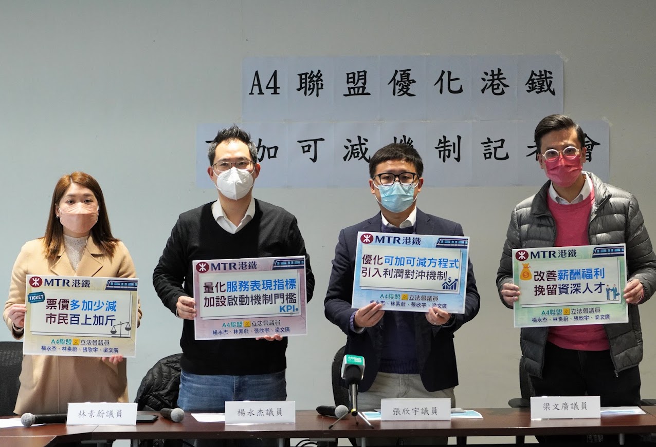 大公文匯全媒體報道,港鐵目前正在檢討票價「可加可減」機制。立法會「A4聯盟」楊永杰、梁文廣、張欣宇、林素蔚認為,該機制實施多年來,受到社會各界質疑,現行票價調整機制容許延後增幅,港鐵在錄得盈利之餘仍然可以加價,未能真實反映港鐵營運成本、普羅大眾的負擔能力、港鐵從土地所得收益和服務表現等。