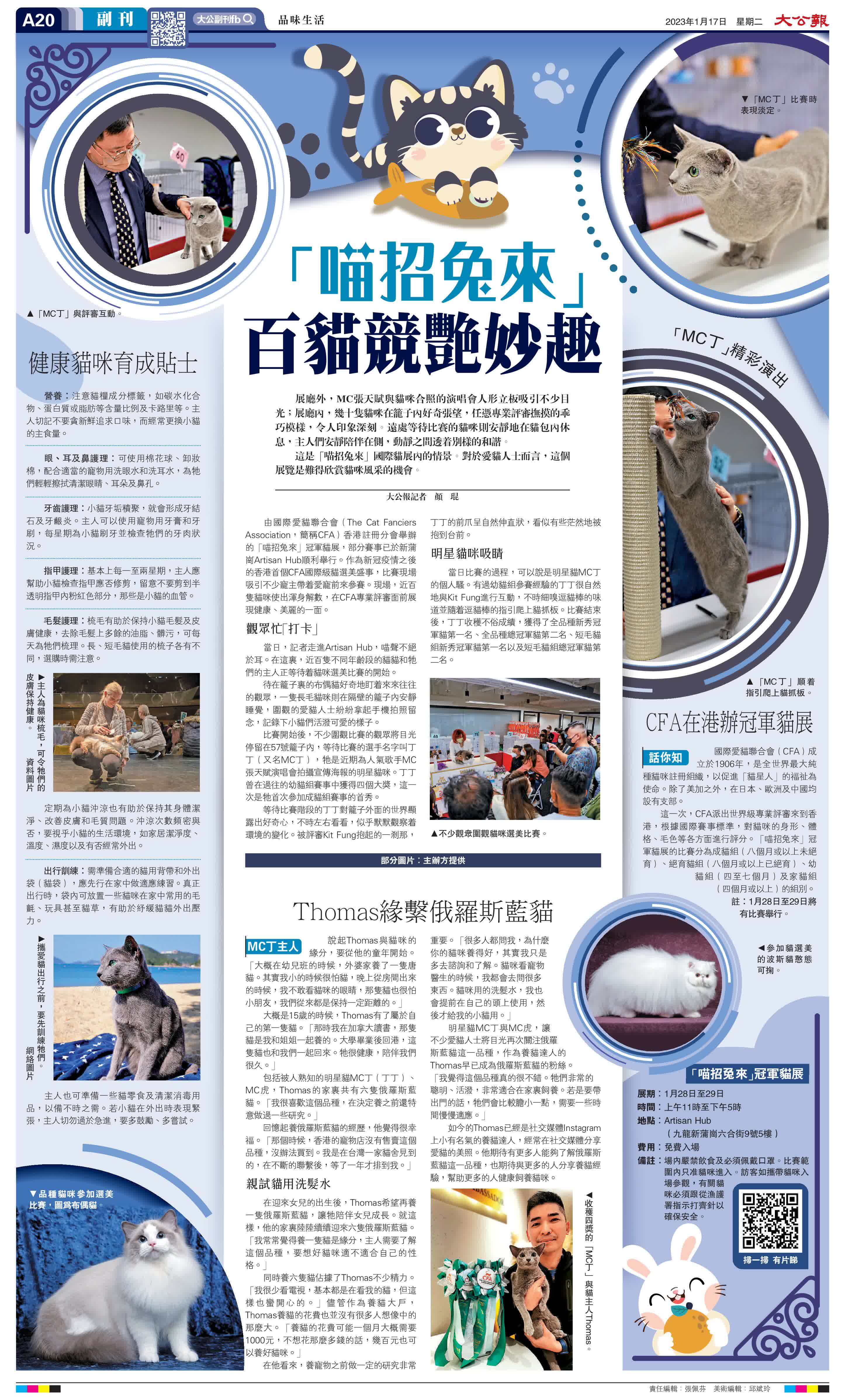 由國際愛貓聯合會(The Cat Fanciers Association,簡稱CFA)香港註冊分會舉辦的「喵招兔來」冠軍貓展,部分賽事已於新蒲崗Artisan Hub順利舉行。作為新冠疫情之後的香港首個CFA國際級貓選美盛事,比賽現場吸引不少寵主帶着愛寵前來參賽。現場,近百隻貓咪使出渾身解數,在CFA專業評審面前展現健康、美麗的一面。