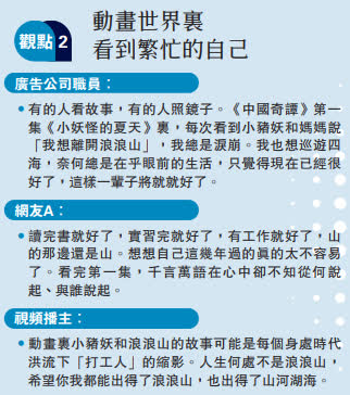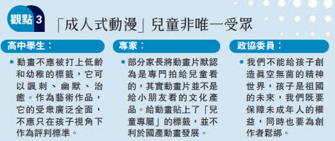 「動畫與書籍紀錄片對孩子的影響是一樣的,不同年齡自然要看不同的書,動畫也是一樣。」溫州市海亮華僑學校語文老師王政表示,很多家長平時工作較忙,朋友同事一推薦就拿給孩子看,這樣對孩子的成長很不利。「現在每部動畫都會有很多影評,只要家長們稍做些功課,就能立判高下。」