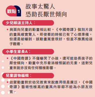(大公報記者 林凱、盧冶)被稱為內地2023年第一部「國潮動漫爆款」,由上海美術電影製片廠和視頻網站嗶哩嗶哩聯手推出的動畫片集《中國奇譚》收穫滿滿讚譽,8個根植於中國傳統文化的「妖怪」故事獨立成篇、橫跨古今,其考究而各異的畫風與情節天馬行空,盡顯中國式想像力。但眾聲喧嘩中,也有不少低齡學童家長表達對《中國奇譚》畫面存在恐怖元素、無教育意義的不滿──「我的孩子被嚇哭了!」網民眼中的「良心之作」《中國奇譚》是否真的「少兒不宜」?