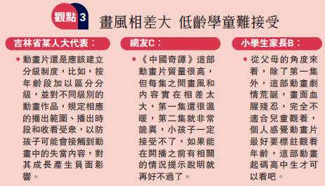 老少咸宜是國產動畫的理想化標準,現實中往往「眾口難調」。被大家所熟知的《喜羊羊和灰太狼》、《熊出沒》、《黑貓警長》等動畫,都曾因家長擔心「不適合自己的孩子觀看」而被舉報下架。而對於《中國奇譚》,有教育專家力挺:「任何一部作品都不可能滿足所有的人的口味。」