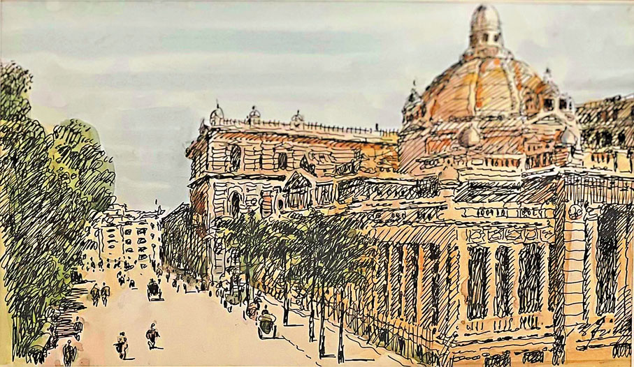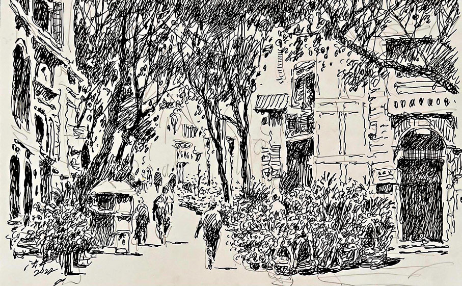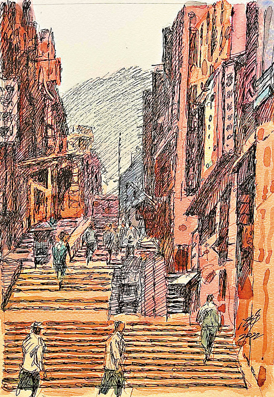 他對香港的迷戀也延展到這個城市他未曾見過的年代。今次展覽中有不少沈平根據舊相片創作的速寫作品,包括建於1911年本可成為香港歷史地標的英國文藝復興風格建築的郵政總局、昔日的皇后大道、中環滙豐銀行、擺花街、1975年的吳淞街……這些都是他從舊照片中發掘題材,再以鋼筆速寫呈現,間中或加以淡彩,令觀者再睹遙遠而溫情的昔日城市風貌。沈平認為,鋼筆線條的剛強與滄桑味道,剛好與這個城市從小漁村一路蛻變而為大都市的歷程相適配:「追憶更早期的香港,描摹它的舊時模樣,可歌可泣的歷史中,也藏着香港人的智慧與奮鬥精神。」