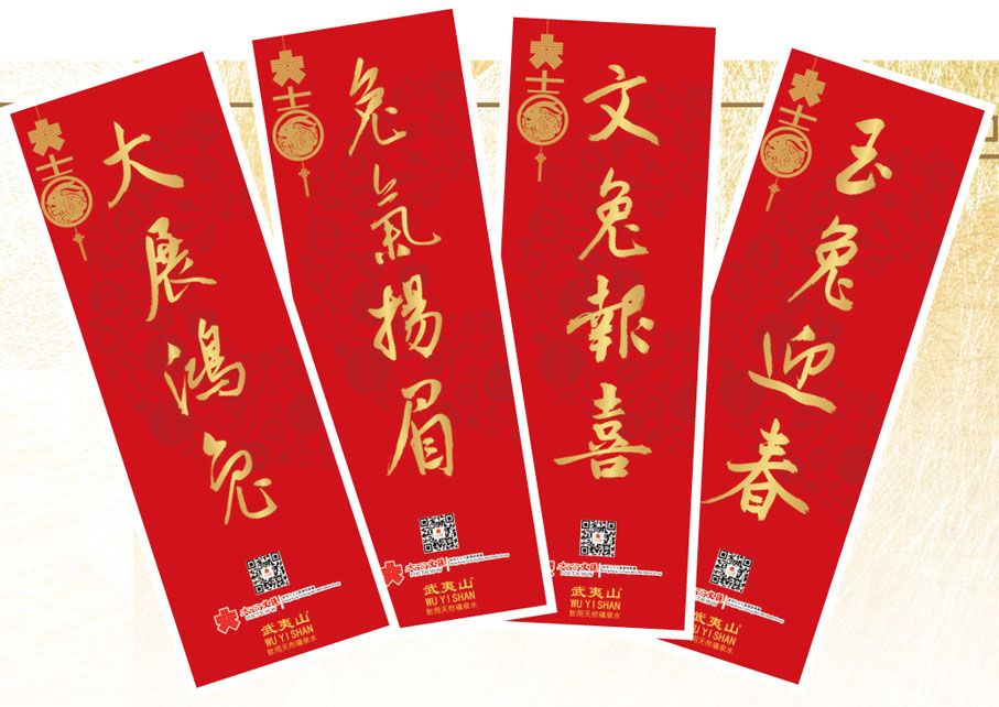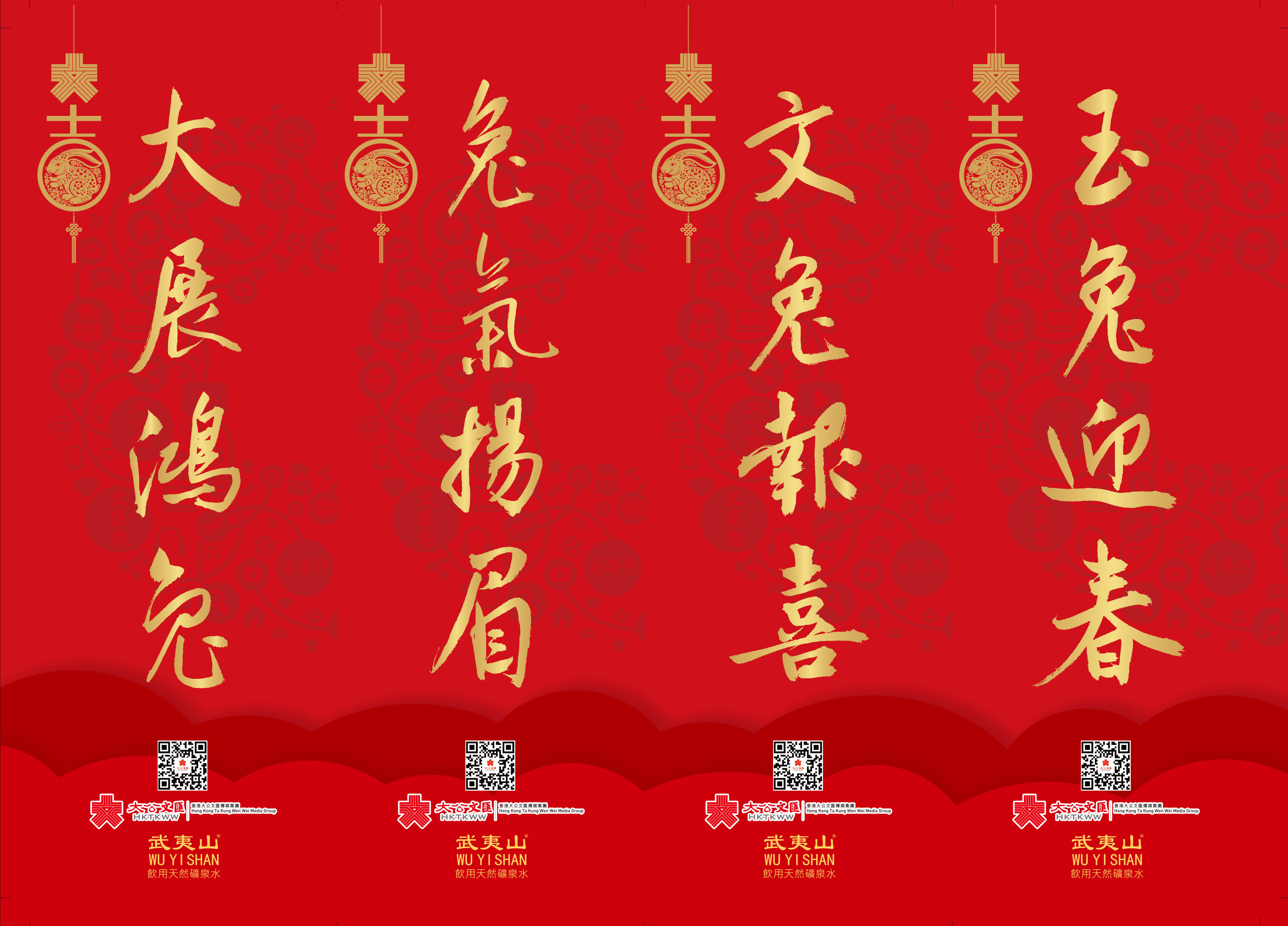 揮春設計將大文集團Logo和鏤空玉兔嵌入「大」「吉」文字中,又以社交網絡圖為背景展示大文媒體移動化、社交化、全媒化的屬性,並分別嵌入大公報、文匯報、香港仔、點新聞元素,傳統與現代感兼備。揮春以「大展鴻兔」「兔氣揚眉」「文兔報喜」「玉兔迎春」,祝福廣大讀者新一年大展宏圖、揚眉吐氣、萬事大吉。
