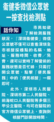 根據微信小程式「國家政務服務平台」進入「全國核酸檢測機構查詢」,名單上的資料顯示,各地不少醫院在農曆新年期間不提供核酸檢測。大公報記者昨日向多個省市相關機構查詢。其中,深圳多間醫院春節期間的服務情況各有不同,深圳市第二人民醫院回覆,春節期間不提供核酸檢測服務;羅湖區人民醫院和北京大學深圳醫院核酸門診則照常開放,但縮短服務時間,僅提供早上八時至中午十二時,以及下午二時至五時。