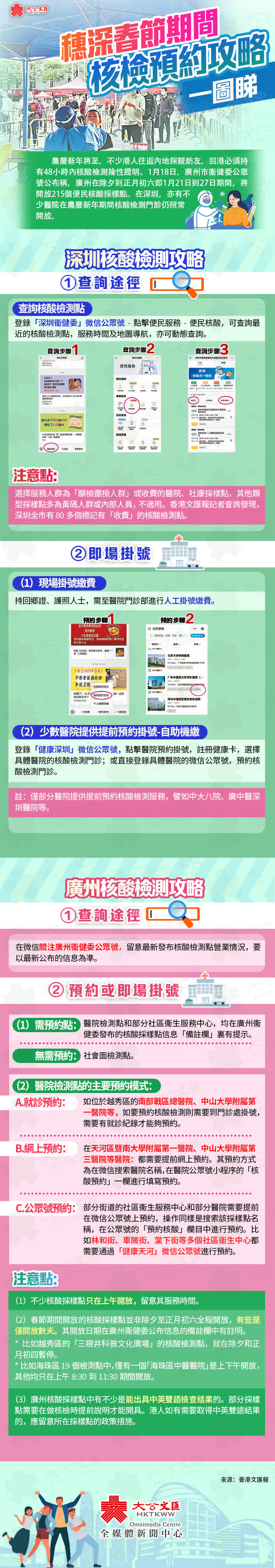 值得注意的是,廣州不少核酸採樣點春節期間只在上午開放,需留意服務時間。此外,這次春節期間開放的核酸採樣點,並非除夕至正月初六全程開放,有些是僅開放數天。比如越秀區的「三眼井科普文化廣場」的核酸檢測點,就在除夕和正月初四暫停。比如海珠區19個檢測點中,僅有一個「海珠區中醫醫院」是上下午開放,其他均只在上午8時30分到11時30分期間開放。港人在做檢測前需認真確認好每個採樣點的具體開放時間。