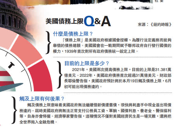 大公報綜合《國會山報》、路透社、彭博社報道:美國財政部長耶倫警告指,美國政府將於19日觸及現行的債務上限,若兩黨無法就提高或暫停債務上限達成共識,美國恐出現有史以來首次債務違約,屆時美國經濟民生乃至全球金融體系都將受到無可挽回的損害。然而,美國兩黨鬥爭日趨激烈,國會眾議院共和黨人將債務上限當作籌碼,要求民主黨同意削減政府開支;民主黨則堅稱提高債務上限「沒有談判餘地」,雙方陷入僵局。