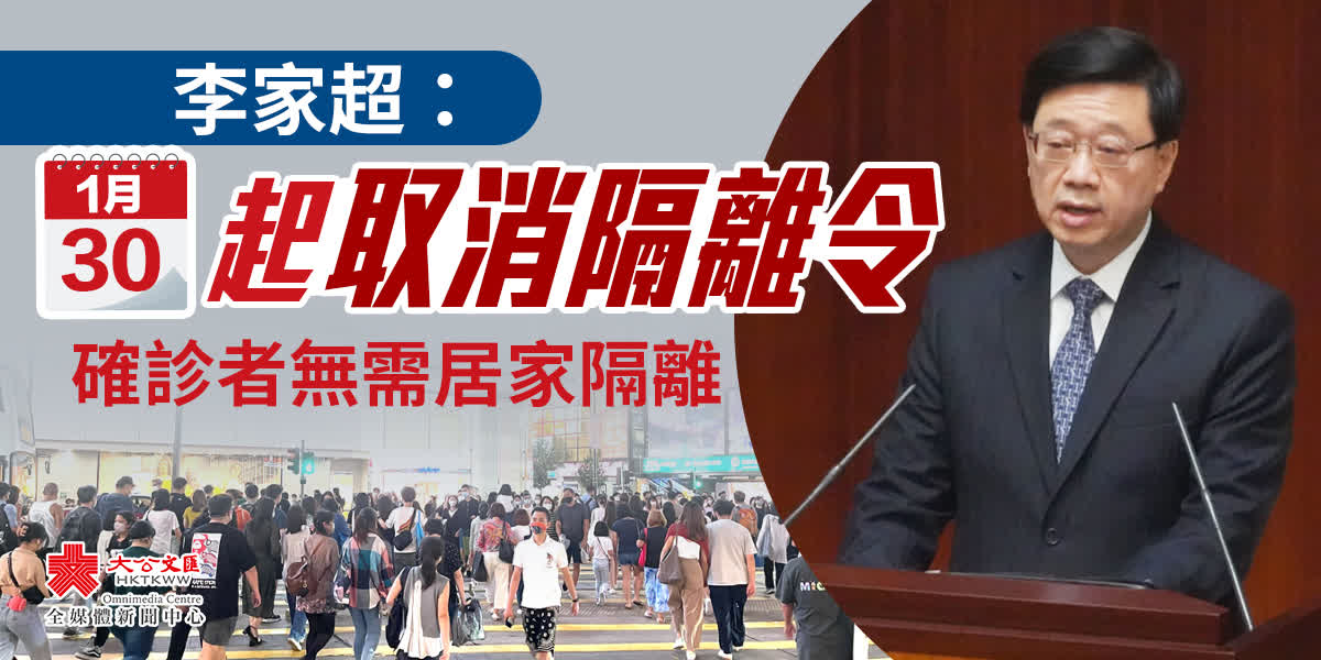 大公文匯全媒體報道,立法會今日(19日)舉行行政長官答問會,李家超出席會議及答覆議員提出的質詢。李家超宣布,1月30日起,取消隔離令,確診者無需居家隔離。