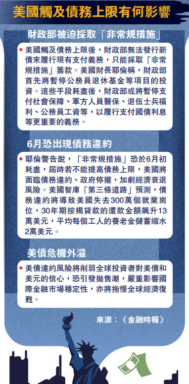 大公報綜合CNBC、路透社、《金融時報》、美聯社報道:美國政府於當地時間19日觸及債務上限,意味着美國財政部無法發行新債來履行現有支付義務。財政部當天開始通過暫停部分投資項目等「非常規措施」維持政府正常運行。但美國兩黨目前嚴重對立,外界擔憂他們遲遲無法就提高債務上限達成共識,導致美國於6月初出現債務違約。一名華爾街銀行家說,美債違約風險將擾亂國際金融市場。