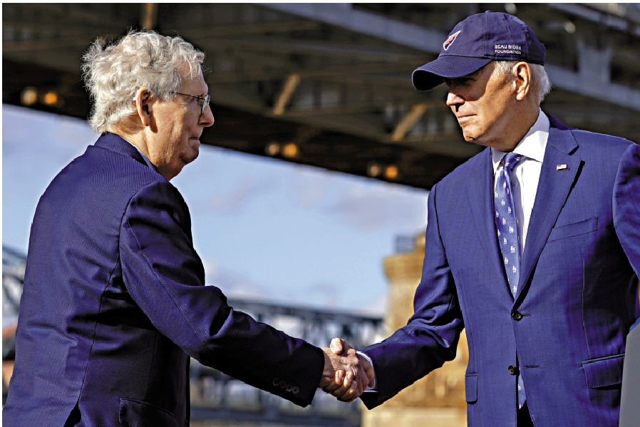 本月4日,拜登與麥康奈爾共同露面,在俄亥俄州和肯塔基州邊境處宣傳2021年兩黨合作通過的基建法案。麥康奈爾日前接受採訪時說,他雖然是參院共和黨領袖,但並不認為自己的工作是反對拜登提出的一切議案。拜登亦表示,兩人有長期合作經歷。