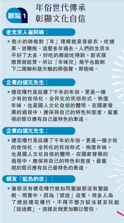 近年來,關於春節期間是否可以燃放煙花爆竹的討論,還從民間上升到國家層面。全國人大代表成新湘曾在全國兩會上呼籲,盡快啟動煙花爆竹燃放習俗申報聯合國非物質文化遺產工作。對於這樣的呼聲,有關部門在回覆中亦指出,煙花爆竹是我國傳承千年的民俗文化藝術產品,燃放習俗是老百姓表達美好希望、抒發幸福情感的傳統方式。這方面建議具有一定的現實意義。