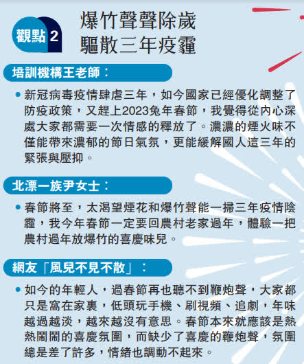 (大公報 記者 張寶峰)「爆竹聲中一歲除」,自古以來,燃放煙花爆竹就是中國人慶祝新年不可或缺的活動之一。十餘年前,出於防止空氣污染、避免意外傷害等客觀理由,內地各省紛紛出台政策禁止燃放煙花爆竹。2023兔年新春,伴隨防疫政策優化調整,連日來,陝西西安、甘肅白銀、山東東營、河南鄭州、南陽等地在部分區域和特定時間段可燃放煙花,政策一經媒體曝光,也迅速贏得一眾網民的點讚。與此同時擔憂之聲再次出現。爆竹炸裂瀰漫的火藥味,是否才是記憶中的「年味」?