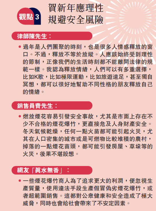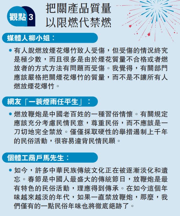 「各地可以根據建築密度、易燃物分布、森林防火特徵等具體情況,制定定時、定點、定品等燃放規劃。如果再配以專業性消防培訓與管控措施,許多傳統的安全風險和污染問題是可以有效控制的。」在吳必虎看來,各地每天都在發生交通事故,但我們並未因此停運,因為加強交通安全、提高安全意識、完善配套設施,才是解決問題的根本之道。傳統文化的延續和改善,也一樣需要多動腦筋。
