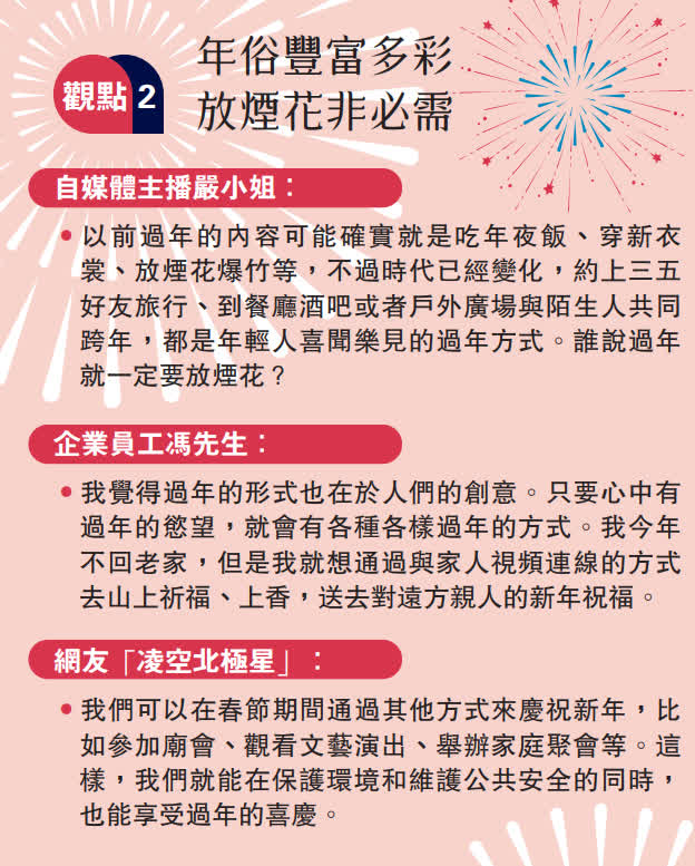 中國民俗學會會員程波濤也表示,煙花不分節令、不顧他人感受,甚至不惜驚擾別人的生活。或者在燃放鞭炮時盲目攀比,認為多燃放鞭炮就能達到發財和招致吉祥的功利性目的,不僅是虛妄的舉動,也是陋俗、惡俗和迷信。