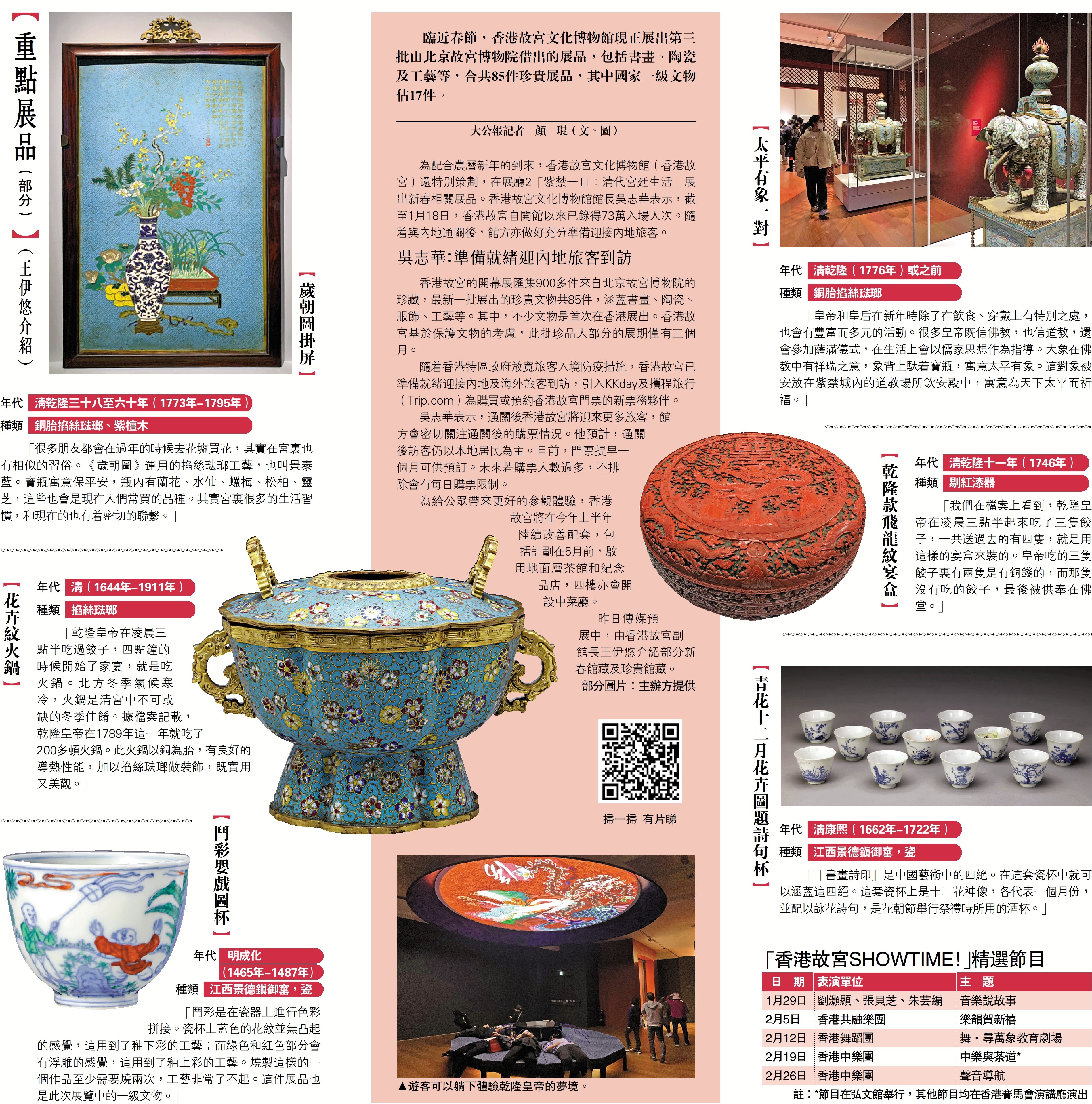 為配合農曆新年的到來,香港故宮文化博物館(香港故宮)還特別策劃,在展廳2「紫禁一日:清代宮廷生活」展出新春相關展品。香港故宮文化博物館館長吳志華表示,截至1月18日,香港故宮自開館以來已錄得73萬入場人次。隨着與內地通關後,館方亦做好充分準備迎接內地旅客。
