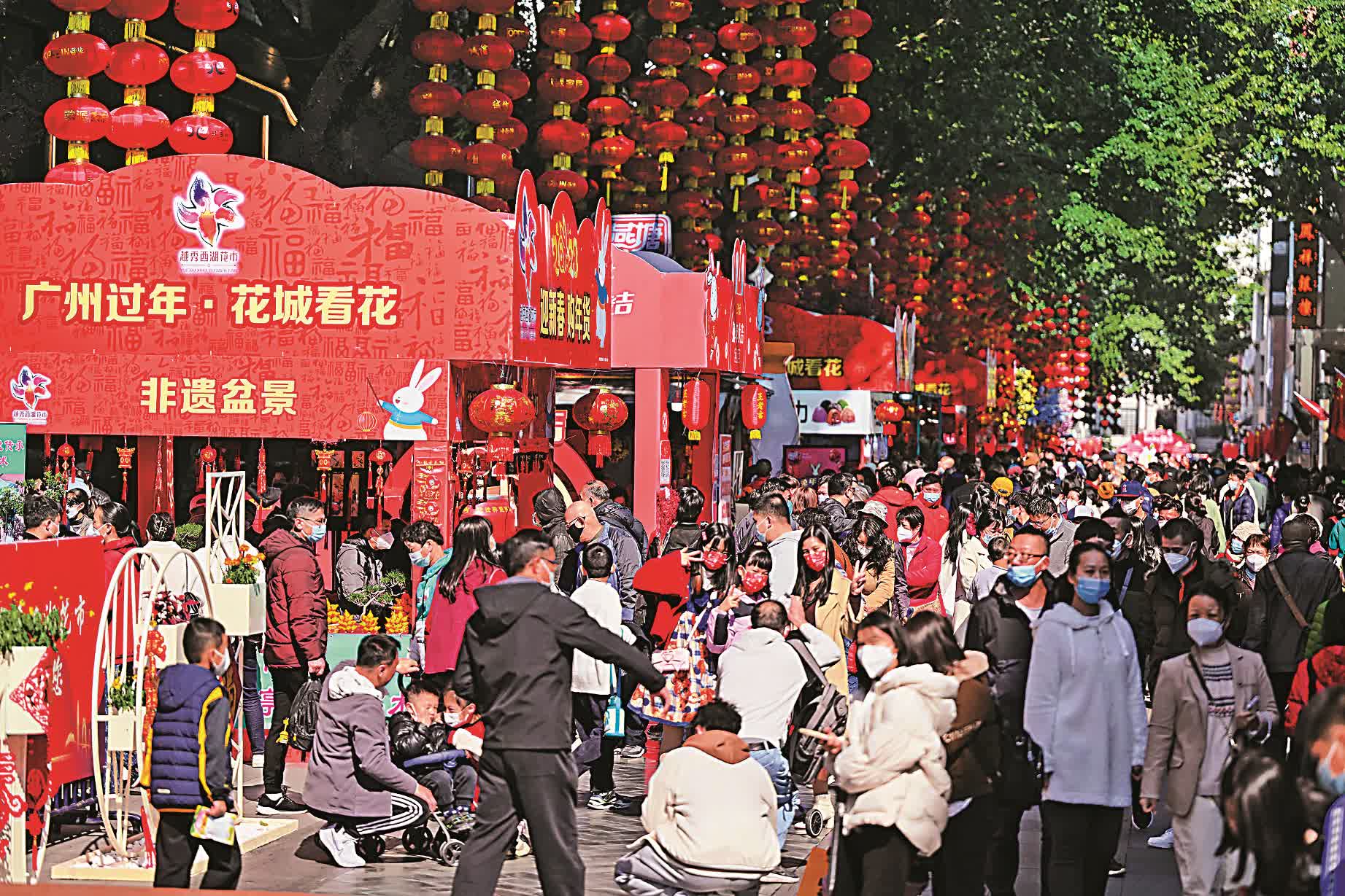 (大公報記者 方俊明 廣州報道)「年廿八,行花街」,行過花街才是年,成為老廣乃至粵港澳民眾獨有的新年儀式感。在「花城」廣州,傳統迎春「百年花市」時隔兩年後全面回歸,街道人山人海。今年迎春花市不單是各區主題花市精巧構思,轄區內各個街道也百花齊放,既有濃厚的廣府風情,更兼具了城市煙火氣。有廣州市民告訴記者:「行花街,買年桔,挑對聯……那個熟悉的廣味年回來了!」也有廣州市民坦言,「行花街」承載着廣府年俗文化和廣州城市記憶,也寄託了對美好生活的新期盼。