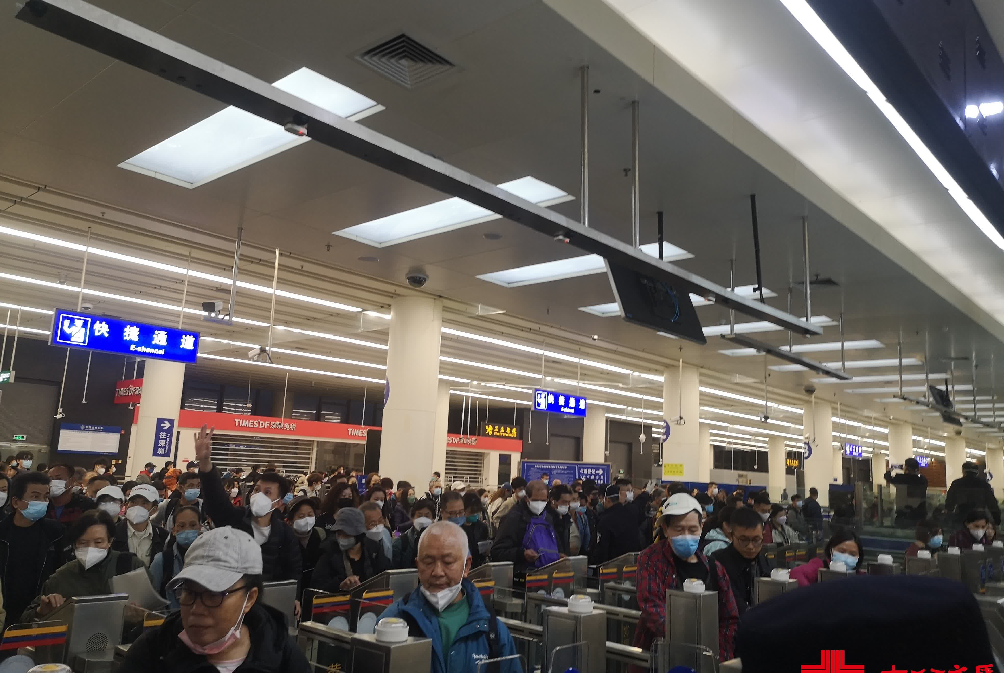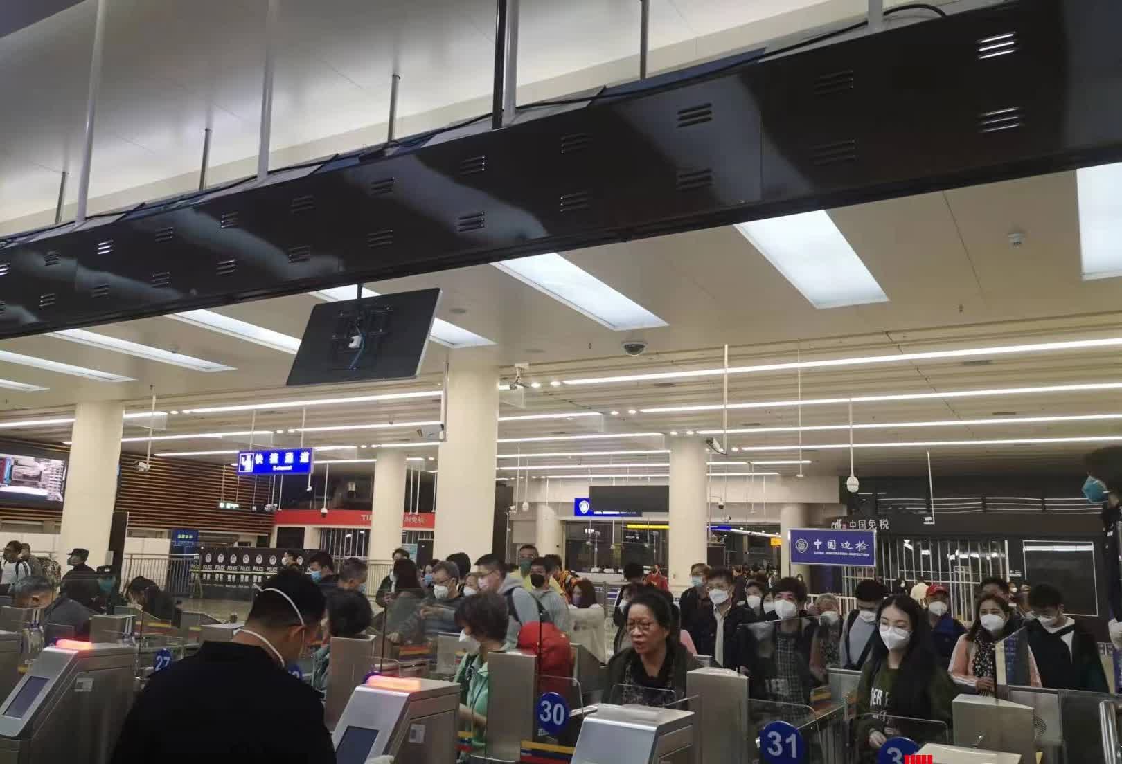 今早9時左右,福田口岸過關過程還算暢順,乘客多為全家出動,拖行李箱準備返鄉。出關口後,不少人群聚集,多為候車接載或等待親友。至今日中午12時左右,口岸人流量明顯增加,東鐵綫乘客須在閘口前排隊等待放行,方可進入海關窗口,隊伍最長時達十幾米,約半小時才放行一批。港鐵落馬洲站大堂內,有喇叭播放廣播,提醒乘客內地入境大堂正實行人流管制,乘客須於閘口前稍後。港鐵職員表示,開閘時間不確定,視乎人流。