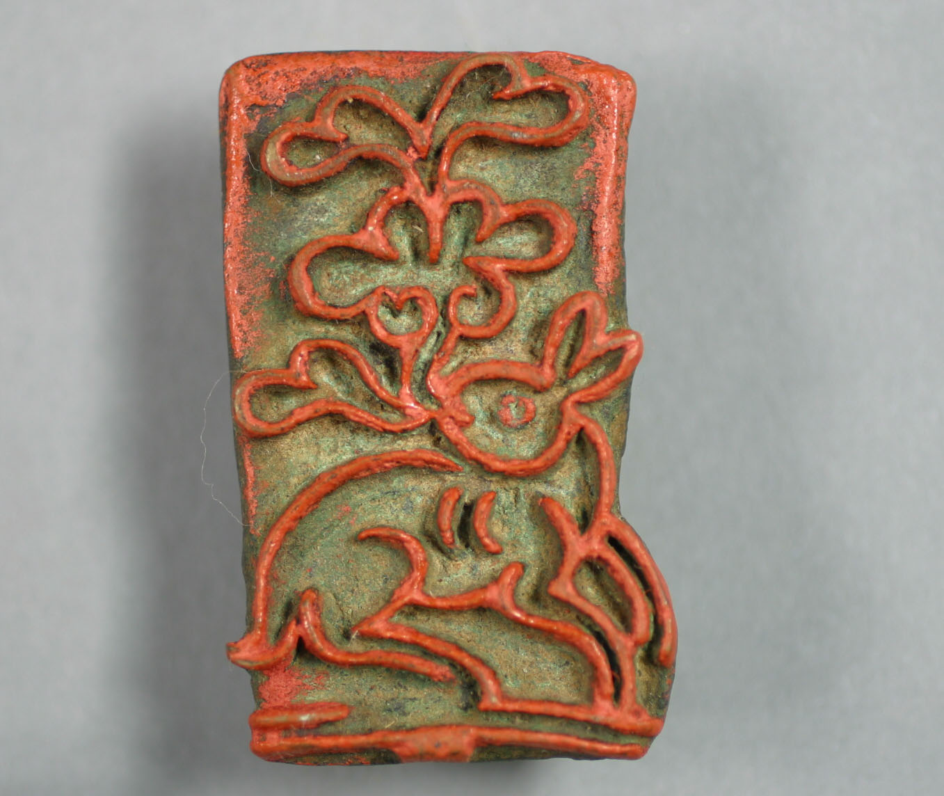押印是以圖形、符號或文字等作為記號,用於憑信防偽的一種印章形式,始於唐宋時期,盛行於元代。元代押印內容十分豐富、形式多種多樣,具有獨特的藝術性。展品中的元代兔紋銅壓印,印面為「兔銜草」圖案。兔子呈回眸之姿,嘴銜仙草,體態靜謐作俯臥狀。
