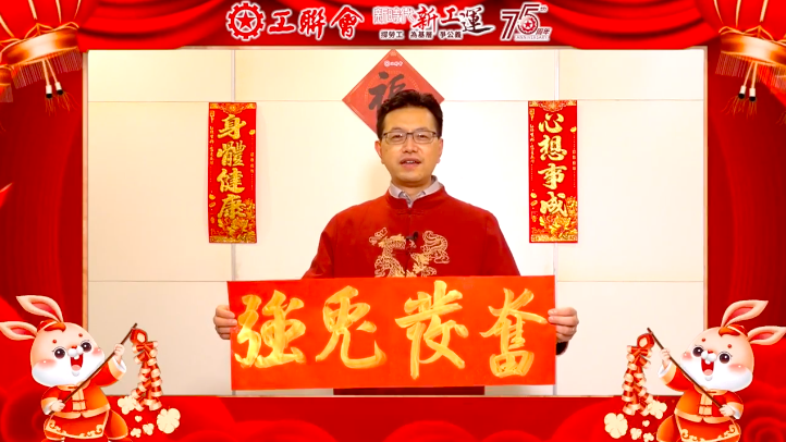 工聯會會長吳秋北則揮毫寫下「奮發兔強」揮春,祝福市民兔年行好運,事事如意,也望疫情盡快結束,經濟盡快恢復。另外,工聯會黃國同時派湯圓,又祝福通關後市民生活恢復正常,「打工仔人人有工開」。