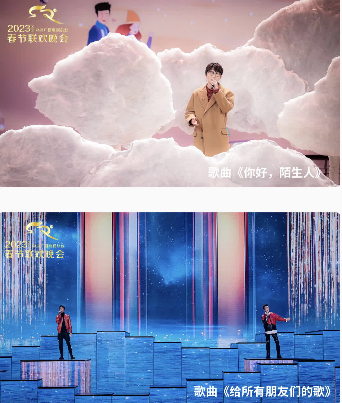 春晚首支定製歌曲《你好,陌生人》盤點了2022年以來平凡人的暖心故事。晚會現場,毛不易與現實中的當事人隔空同唱,傳遞着「心連着心」的溫暖,感恩浩瀚人海中善良的陌生人。孫楠、李克勤兩位老友合作帶來的《給所有朋友們的歌》唱出了平凡歲月中的真摯友誼。小柯、沙溢、秦海璐、李光潔、胡夏、孟慧圓共同演唱歌曲《馬上就會好的》表達了「勇敢一點 坦然出發」的暖心鼓勵。