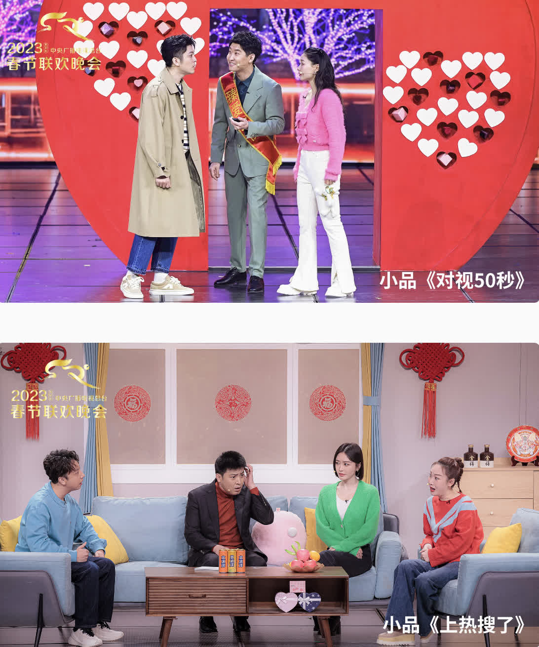 小品《馬上到》聚焦人與人之間的寬容理解,王寶強、楊紫、王寧講述一個因職業身份臨時互換而歡樂十足的暖心故事。脫口秀演員趙曉卉、邱瑞、徐志勝、何廣智坦誠回憶自己的過年趣事,貼近生活的幽默表達引發現場笑聲不斷。岳雲鵬和孫越一個《我的變、變、變》,讓觀眾捧腹不止。金靖、鐵男、閆佩倫的小品《對視50秒》,引發用真心真意對待身邊愛人的共鳴。孫濤、秦嵐、黃才倫、黃楊的小品《上熱搜了》,講述了一段因視頻引發的兩個家庭從誤會到理解的故事。
