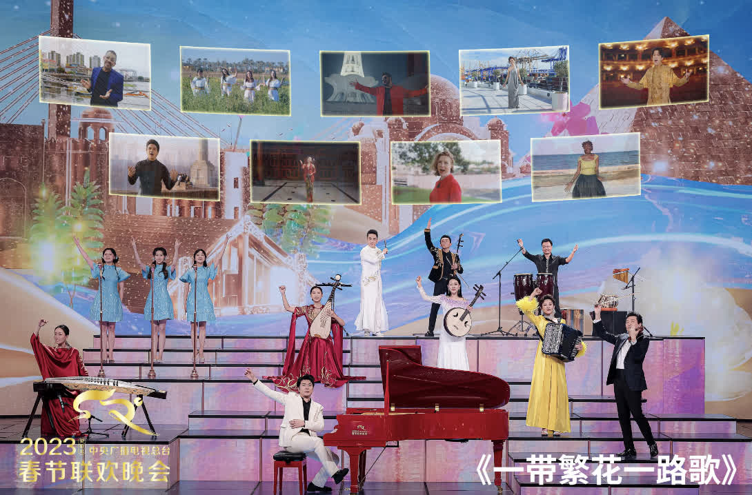 作為全球華人共同的文化年夜飯,除夕之夜一起守歲看春晚、同唱一首歌已經成為連接全球華人的情感紐帶。今年是「一帶一路」倡議提出的第十年。春晚舞台上,「一帶一路」沿線國家的藝術家們與中國音樂家一起相聚雲端,共同帶來《一帶繁花一路歌》。以花為名,飛花為令,唱響各國經典歌曲,以開放姿態展現文明交流互鑒帶給各國人民的喜悅與歡欣。