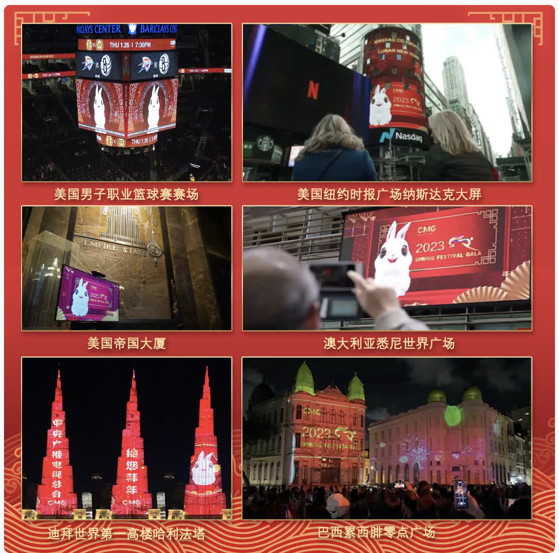 今年,總台首次實現「全球千屏」看春晚。2023年春晚宣傳片登陸了全球超過1600塊戶外大屏和院線銀幕,總台兔年春晚燈光秀點亮了美國世貿中心、帝國大廈,羅馬鬥獸場,迪拜世界第一高樓哈利法塔,悉尼世界廣場,東非最高建築埃塞俄比亞商業銀行新總部大樓,巴西累西腓零點廣場,以及中國香港維多利亞港、澳門旅遊塔等多個全球地標性建築。萌萌可愛「兔圓圓」,吉祥喜慶中國紅,來自總台春晚的新春祝福吸引了世界目光。
