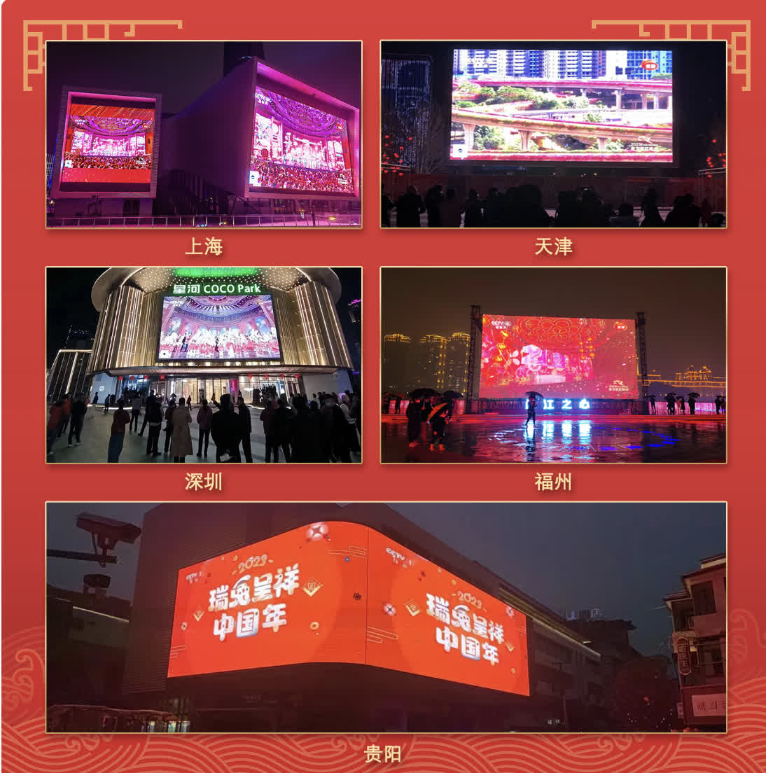 今年總台還推出「百城千屏+雲聽」雙平台同步直播春晚。在北京首鋼園、上海國際傳媒港、成都春熙路大屏、深圳星河COCO Park廣場、貴陽花溪十字街戶外大屏等全國70多個城市的500多塊「百城千屏」8K超高清公共大屏同步直播春晚,配合雲聽客戶端的三維菁彩聲,帶來纖毫畢現的沉浸式視聽效果。城市夜空下,為依然奮戰在工作崗位、無法回家過年的城市建設者、服務者們,提供了一隅共慶新春、共享團圓的溫暖空間。